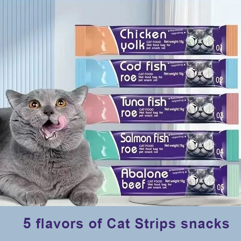 5 flavors/30 Strips Pet Snacks Cat Strips Adult and Young Cat Wet Food Pack Cat Liquid Snacks Pudding Tuna+Fish roe Formula Mixed Flavor 16g/Strips
