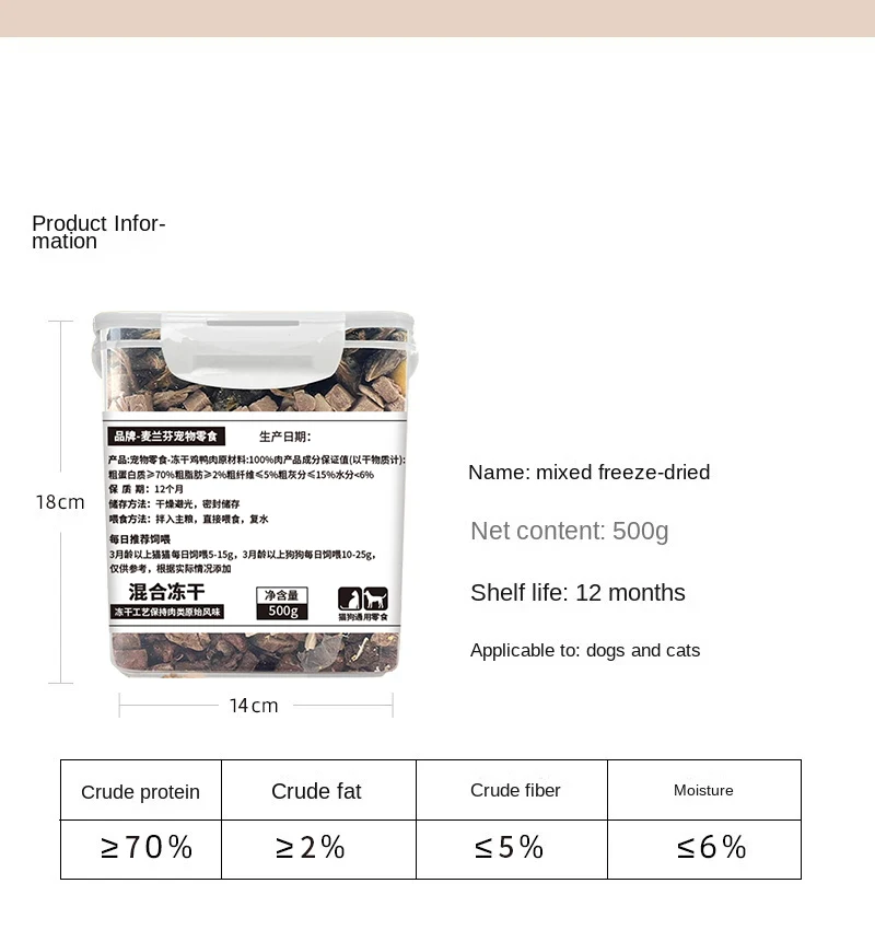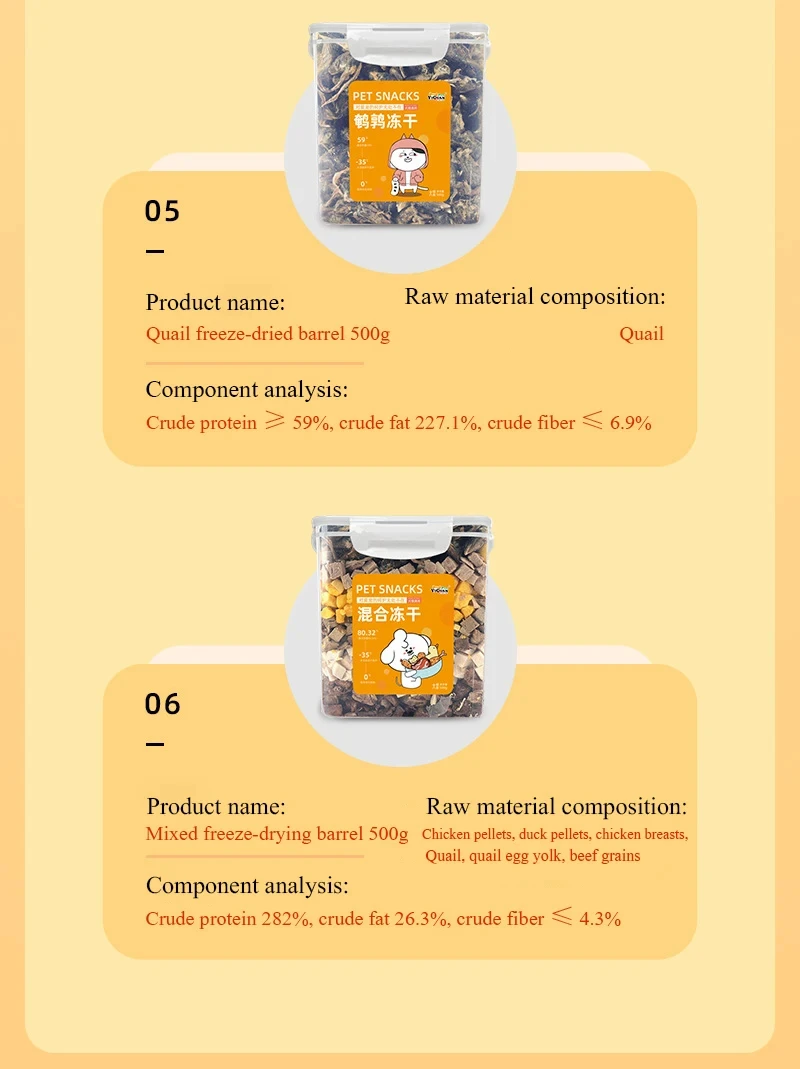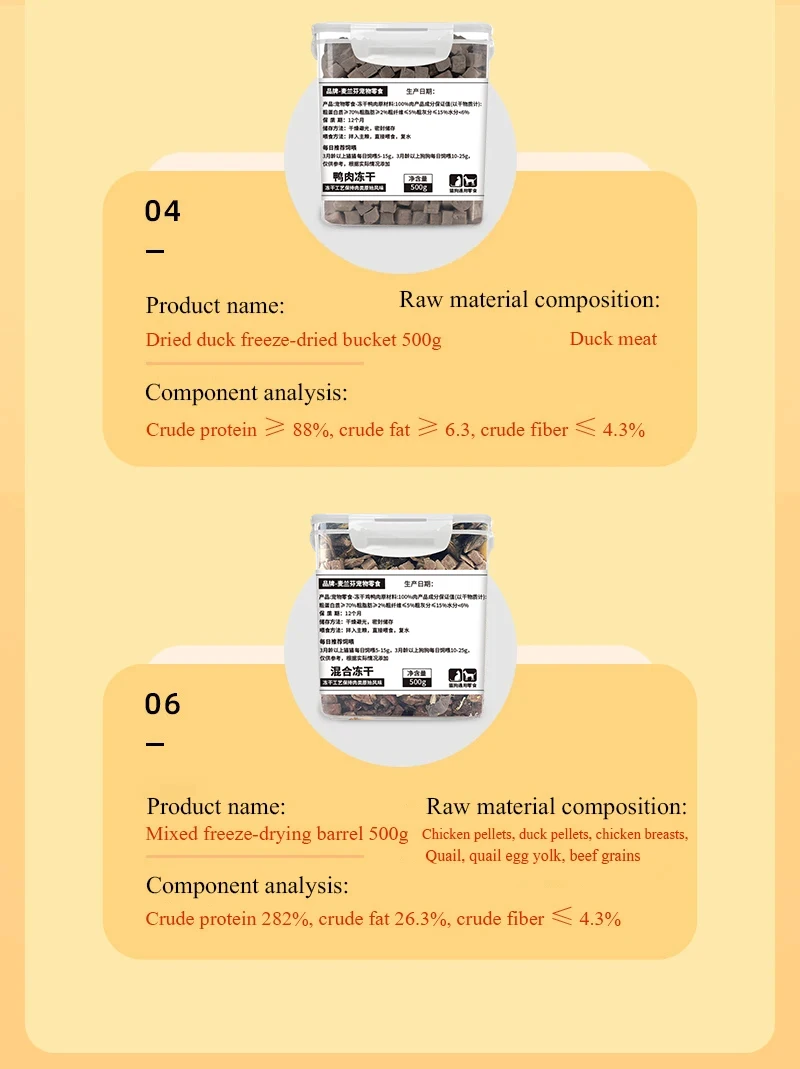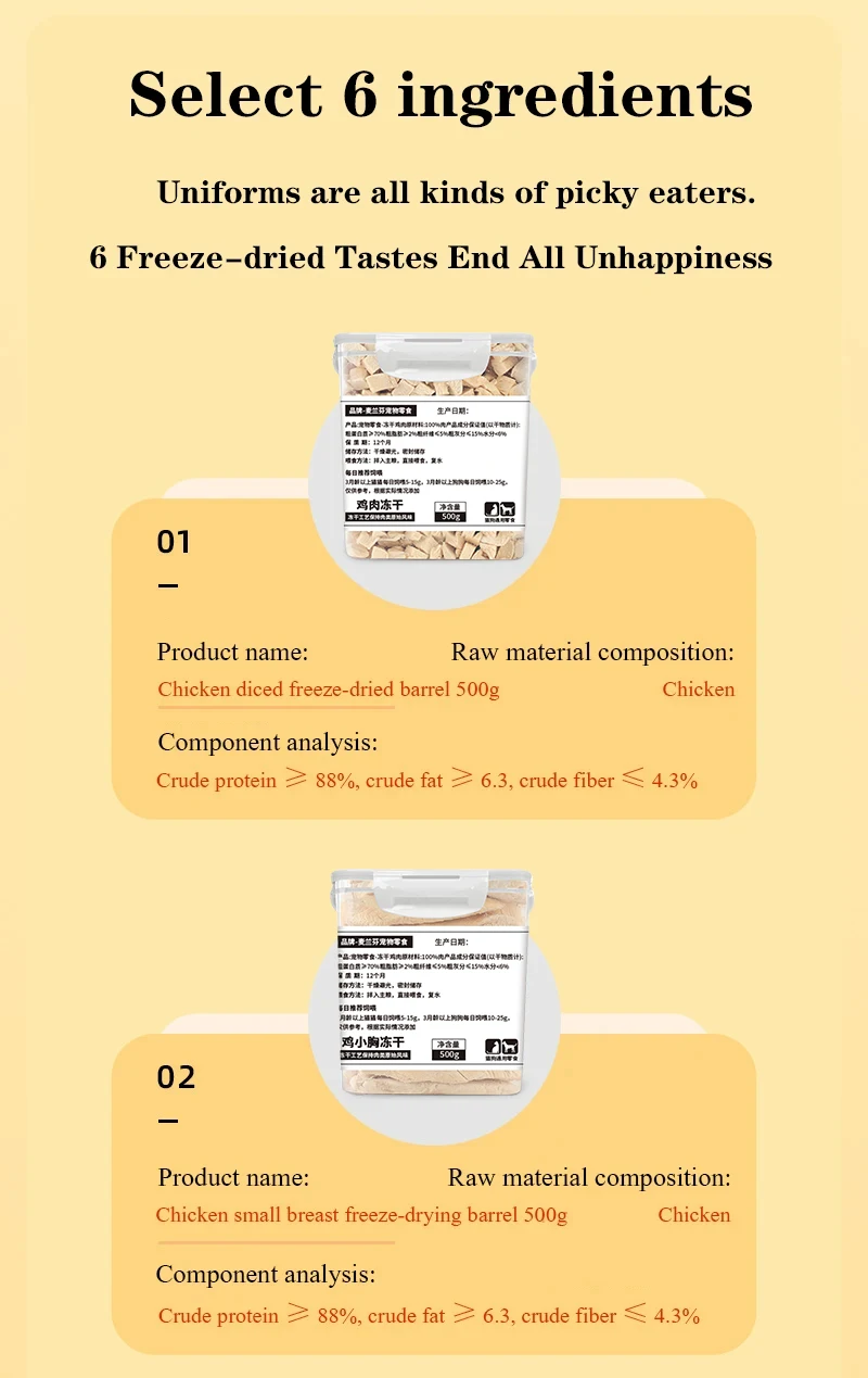 | Taste | Chicken freeze-dried 500g, beef freeze-dried 500g, duck meat freeze-dr |