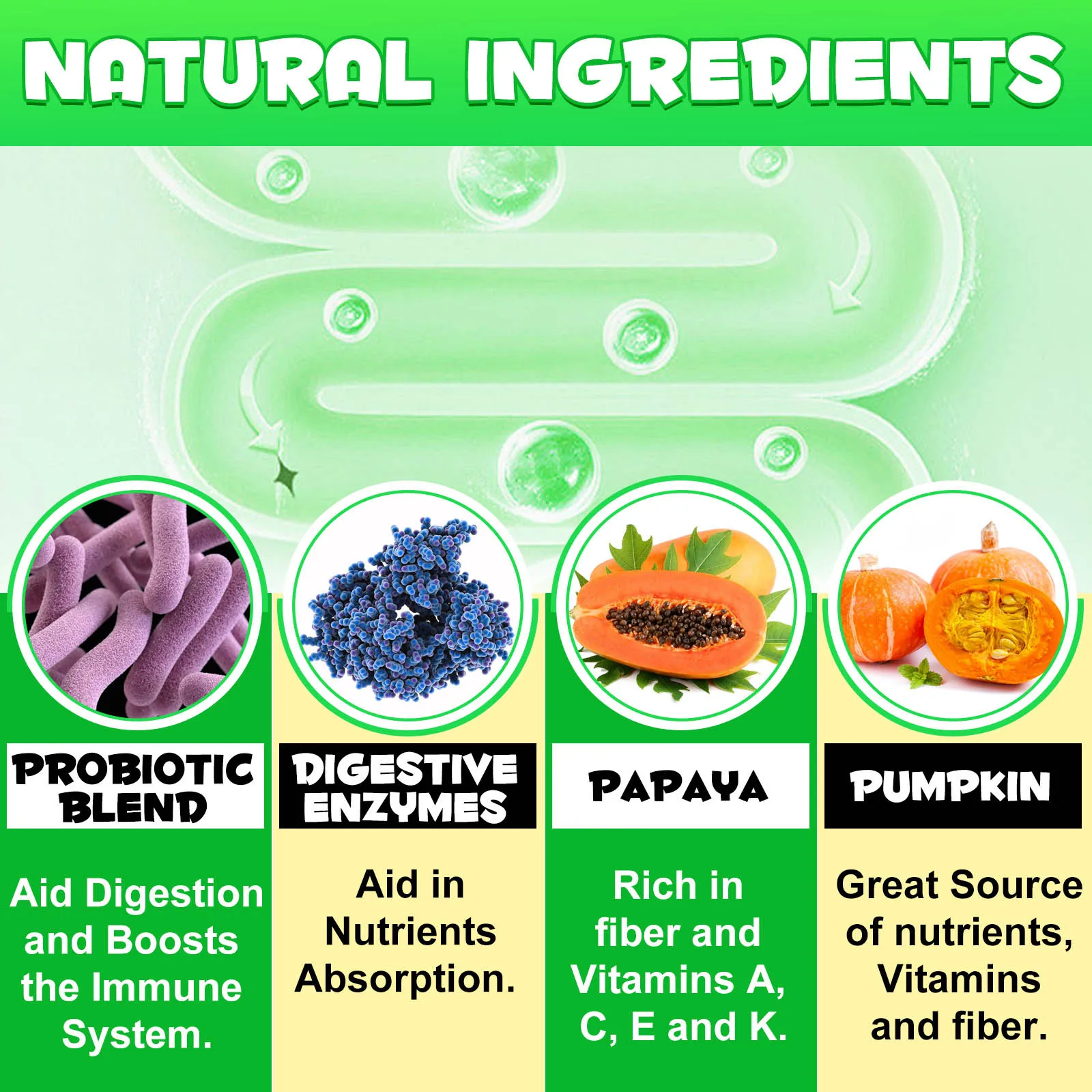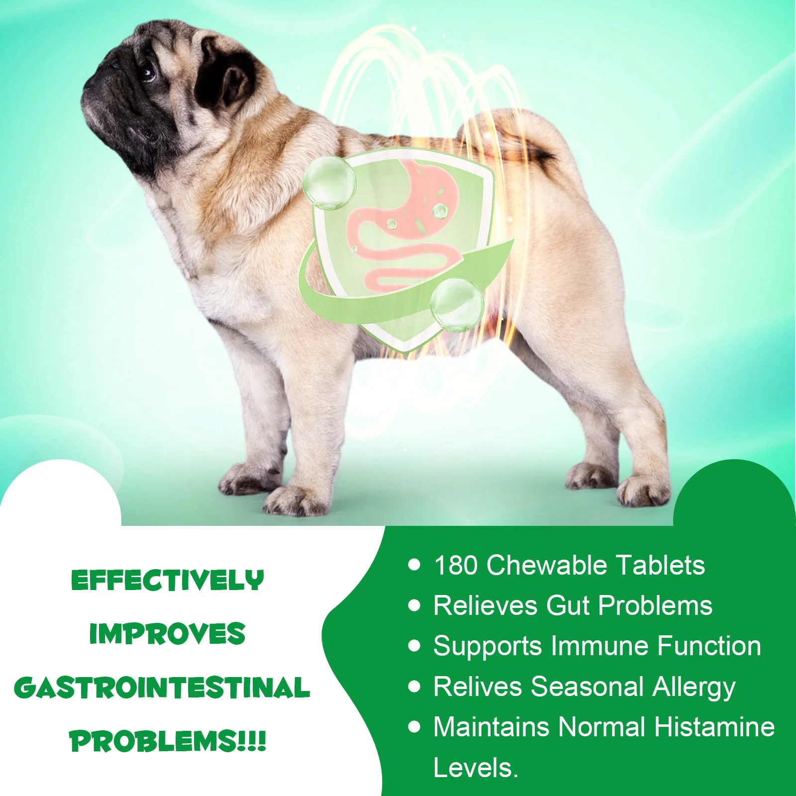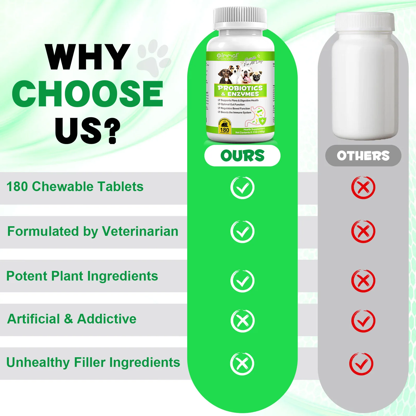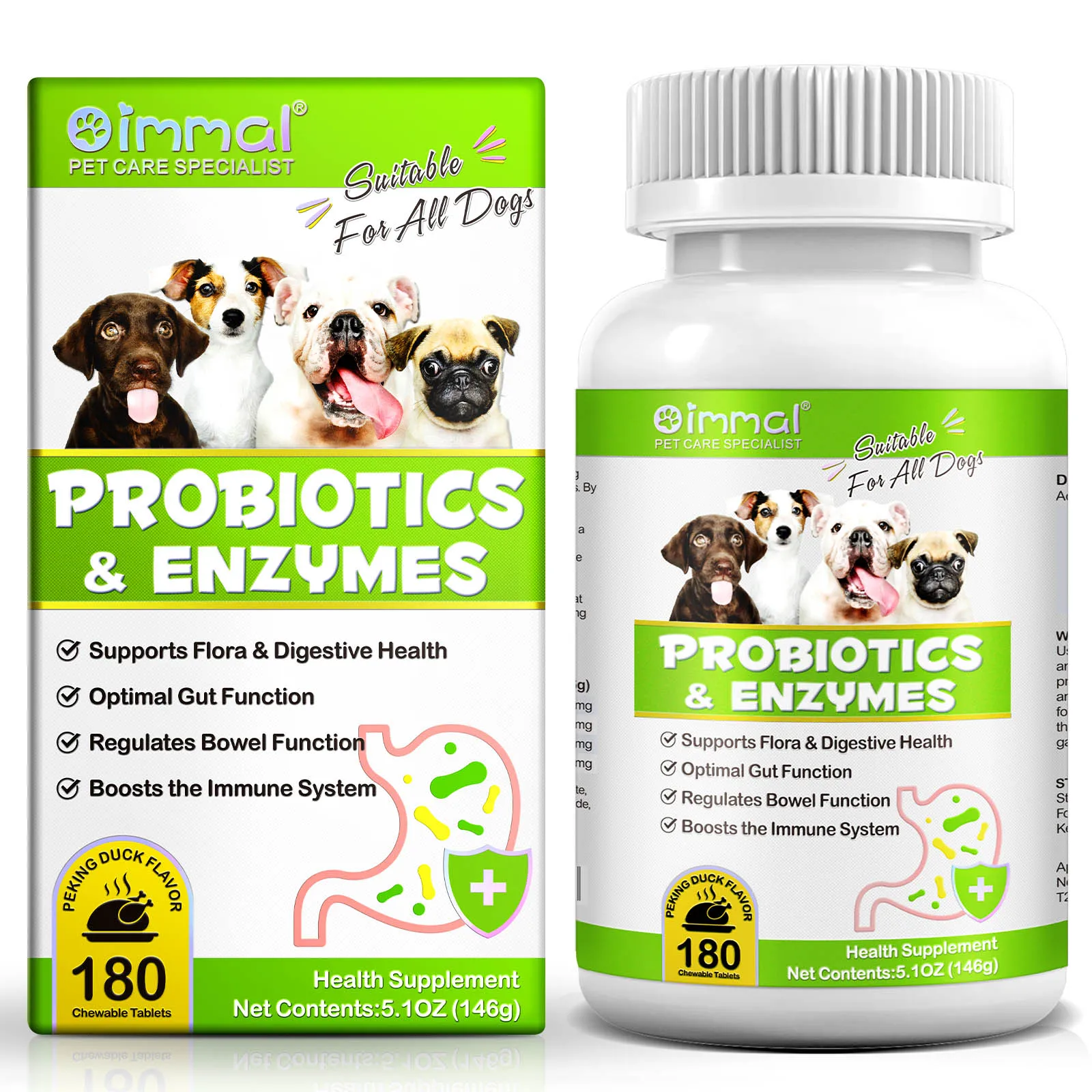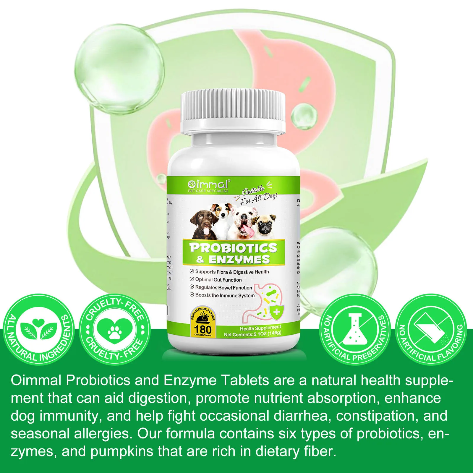 Oimmal Probiotics and Enzyme Tablets are a natural health supplement. Our formula contains 6 types of probiotics, enzymes and pumpkins rich in dietary fiber, which can aid digestion, promote nutrient absorption, enhance dog immunity, and help fight occasional diarrhea. and problems such as constipation and seasonal allergies.